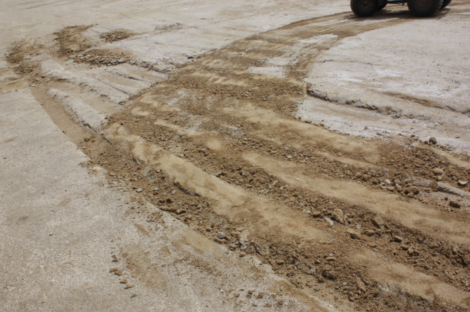 운동장 초입에 깊은 크레인 타이어 자국이 생겼습니다.